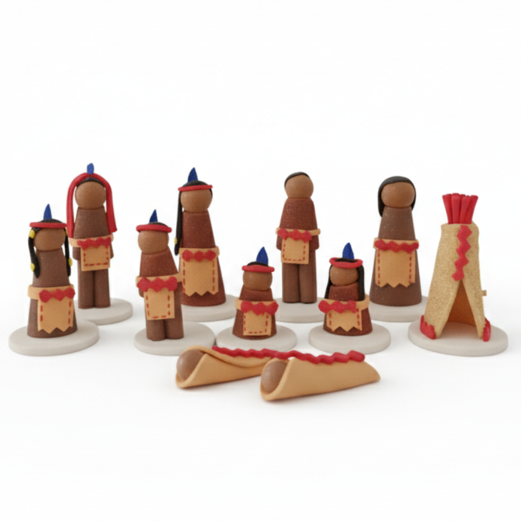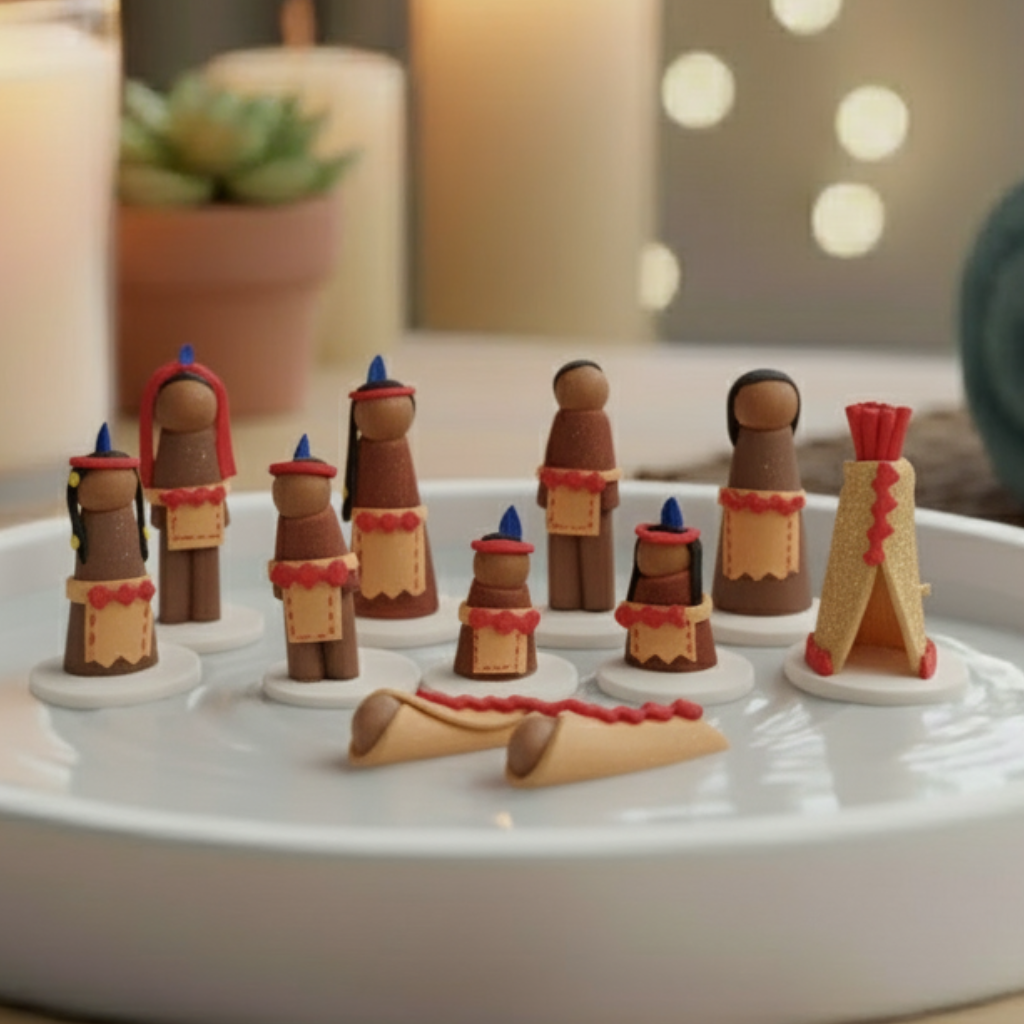Kit Família Indígena 3D representa a sabedoria ancestral, a união familiar e a conexão com as raízes da Terra.
