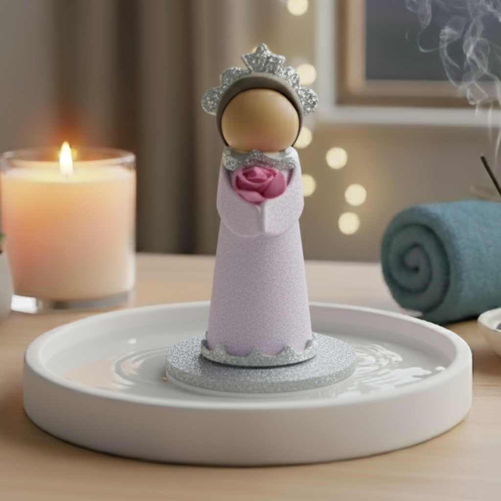 Feita em Etileno Acetato de Vinila (EVA) — material leve, flexível e resistente à água —, a Mestra do Amor flutua naturalmente, trazendo beleza e serenidade para constelações realizadas em água ou sobre mesa.