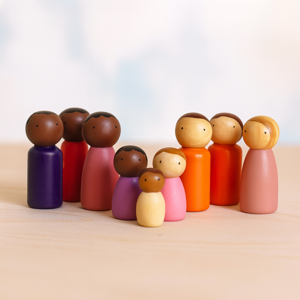 O acabamento artesanal dá vida a cada peça, com cabelinhos e olhinhos pintados à mão, mantendo o design minimalista que permite que o cliente projete sua própria história.