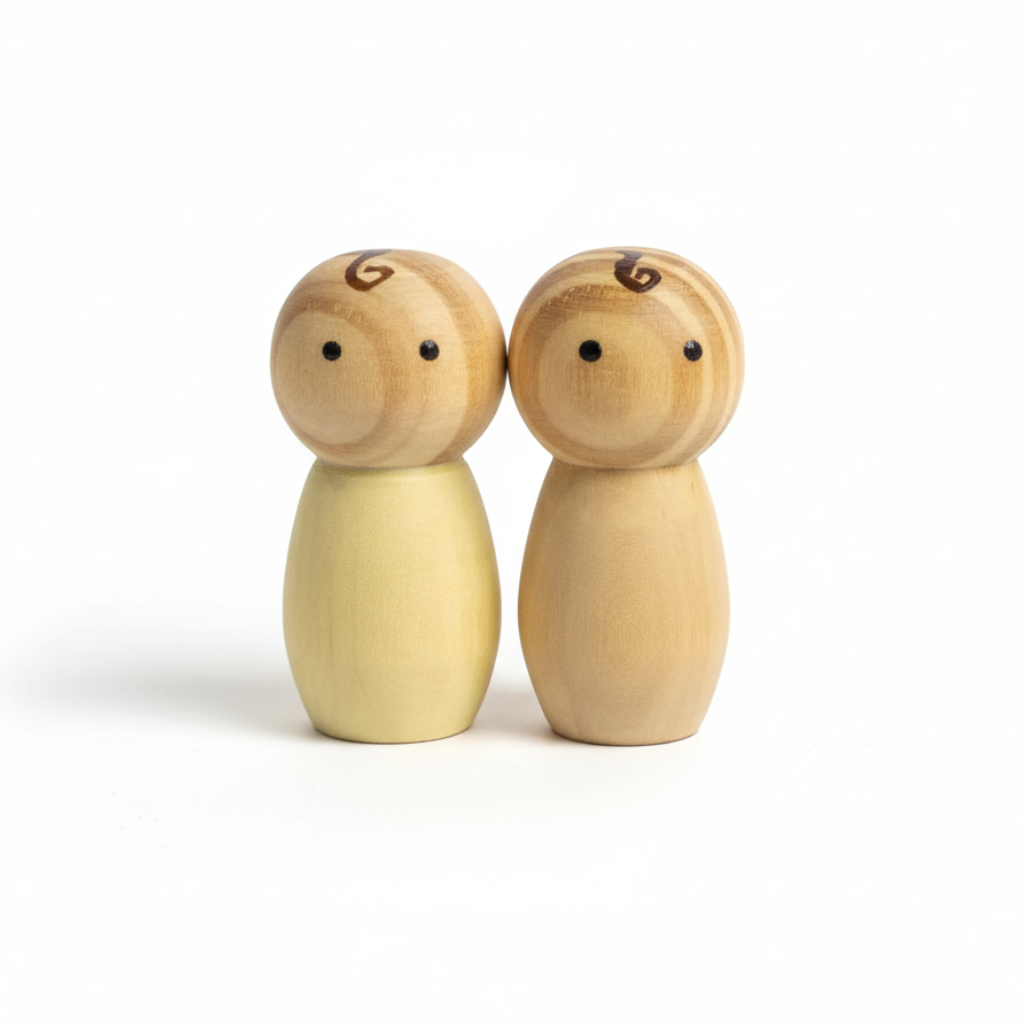 Cada peça é artesanal — olhinhos e cabelinhos pintados à mão, expressando cuidado e sensibilidade em cada detalhe.