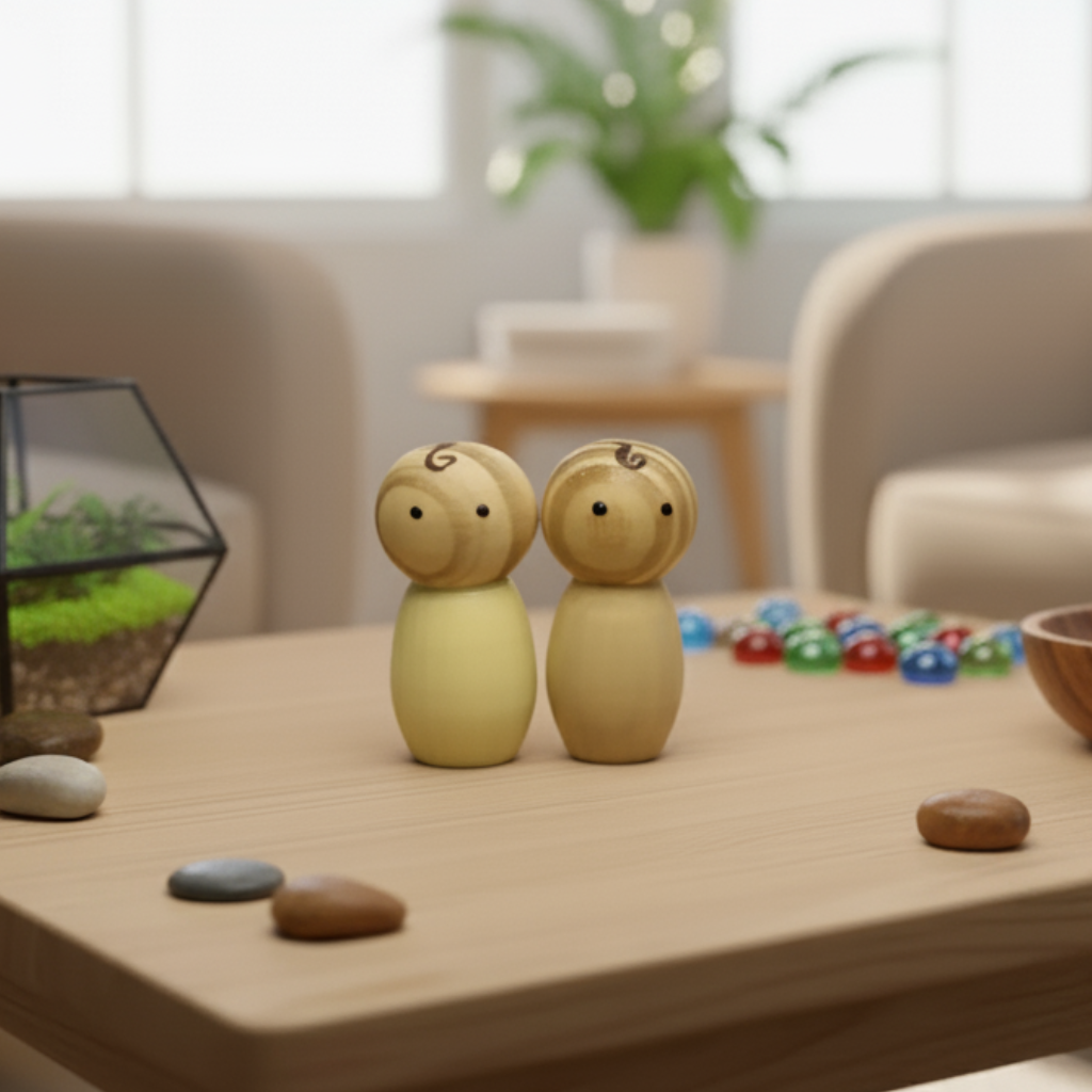 Produzido em madeira nobre e envernizada, o boneco tem presença firme e textura suave, unindo sobriedade e acolhimento.