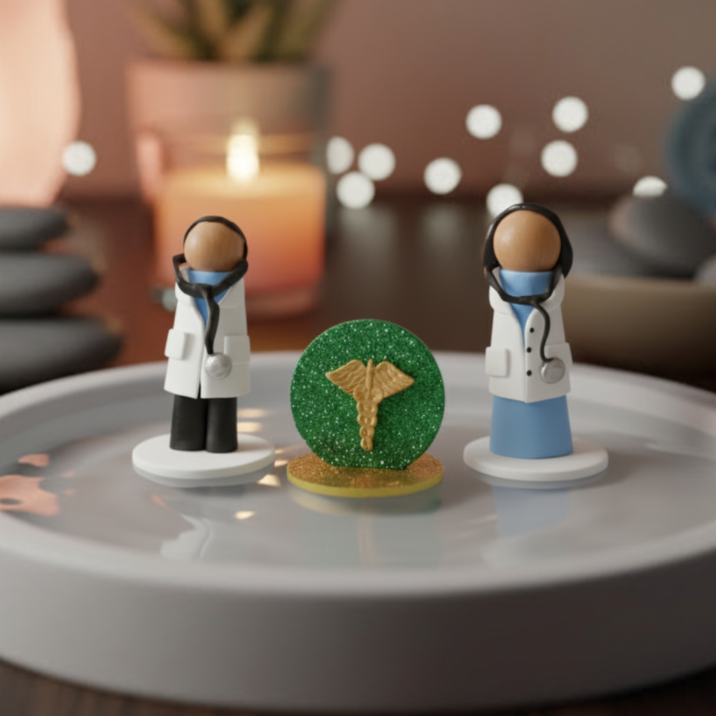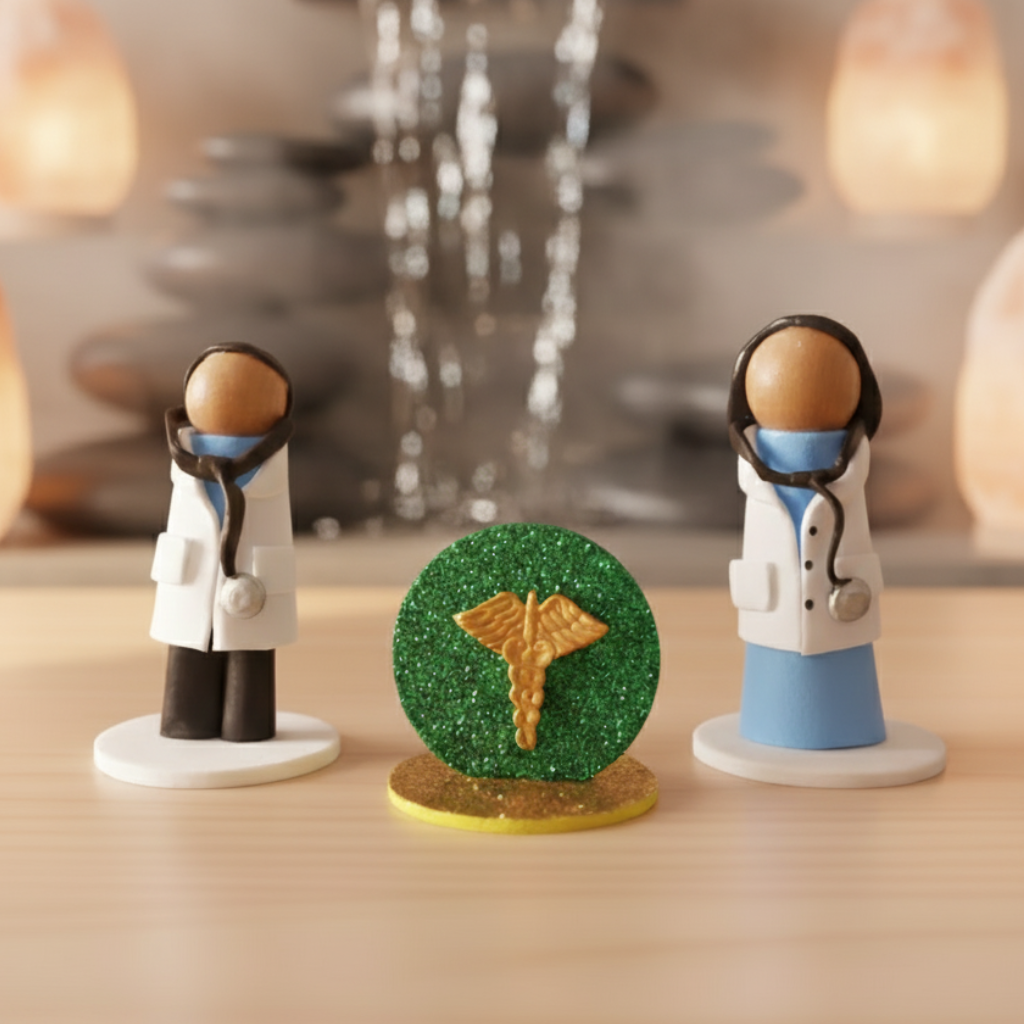 Composto por figuras que simbolizam o homem, a mulher e o símbolo da saúde, este conjunto auxilia no trabalho terapêutico voltado à restauração energética, autocuidado e reconexão com o fluxo da vida.