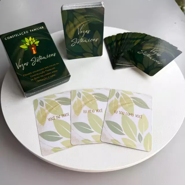 Você já sentiu que uma única frase pode mudar tudo? As Vozes Sistêmicas são 88 cartas com frases de cura usadas por Bert Hellinger, pensadas para apoiar processos de autoconhecimento e transformação na Constelação Familiar.