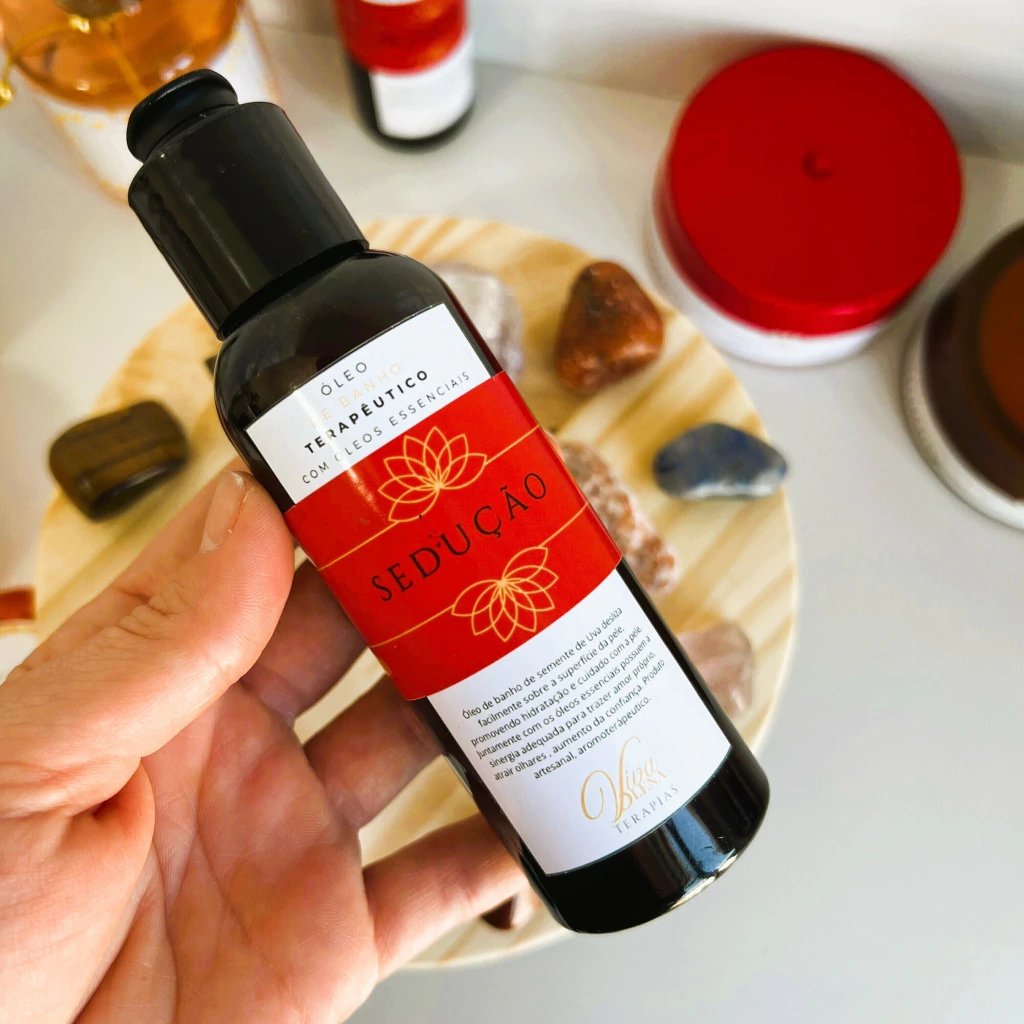 Transforme seu banho em uma rotina de autocuidado, prazer e poder pessoal com o Óleo de Banho Terapêutico SEDUÇÃO. Feito com óleo de semente de uva, altamente nutritivo e hidratante, essa fórmula é enriquecida com uma combinação afrodisíaca de óleos essenciais de rosas, ylang-ylang, sândalo e canela, que despertam os sentidos e acendem a chama da sensualidade.